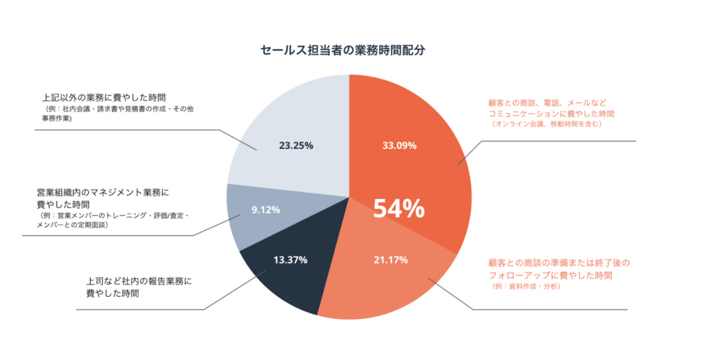 HubSpot社がおこなった調査によると、営業担当者が顧客とのやりとりに使っている時間は、業務時間の54%を占めていることがわかりました。理想として「1日にあと25分、顧客と接する時間を増やしたい」と考えている担当者も多いようです。